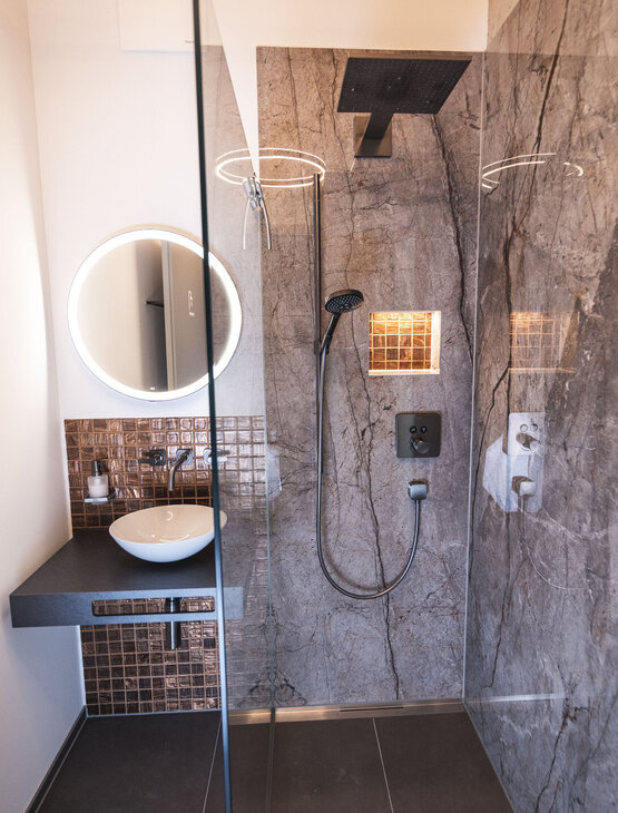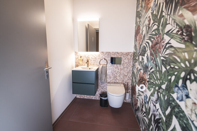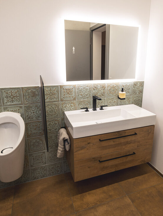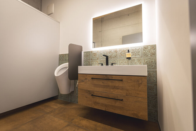 Nicht nur in puncto Energieeffizienz, sondern auch in Bezug auf Design und Funktionalität setzen wir Massstäbe. Die WC-Anlagen und Duschen wurden mit speziellen Platten ausgestattet. Im Herren-WC liegen die Schwerpunkte auf schwarzen Armaturen, dem Monolith Plus sowie dem Dusch-WC Aquaclean Mera Comfort. Im Damen-WC hingegen dominiert die Linie Rosagoldchrom gebürstet, vom Mischer bis hin zum Papierhalter. Ein versenkter Spiegelschrank mit Unterbeleuchtung rundet das Gesamtbild stilvoll ab.